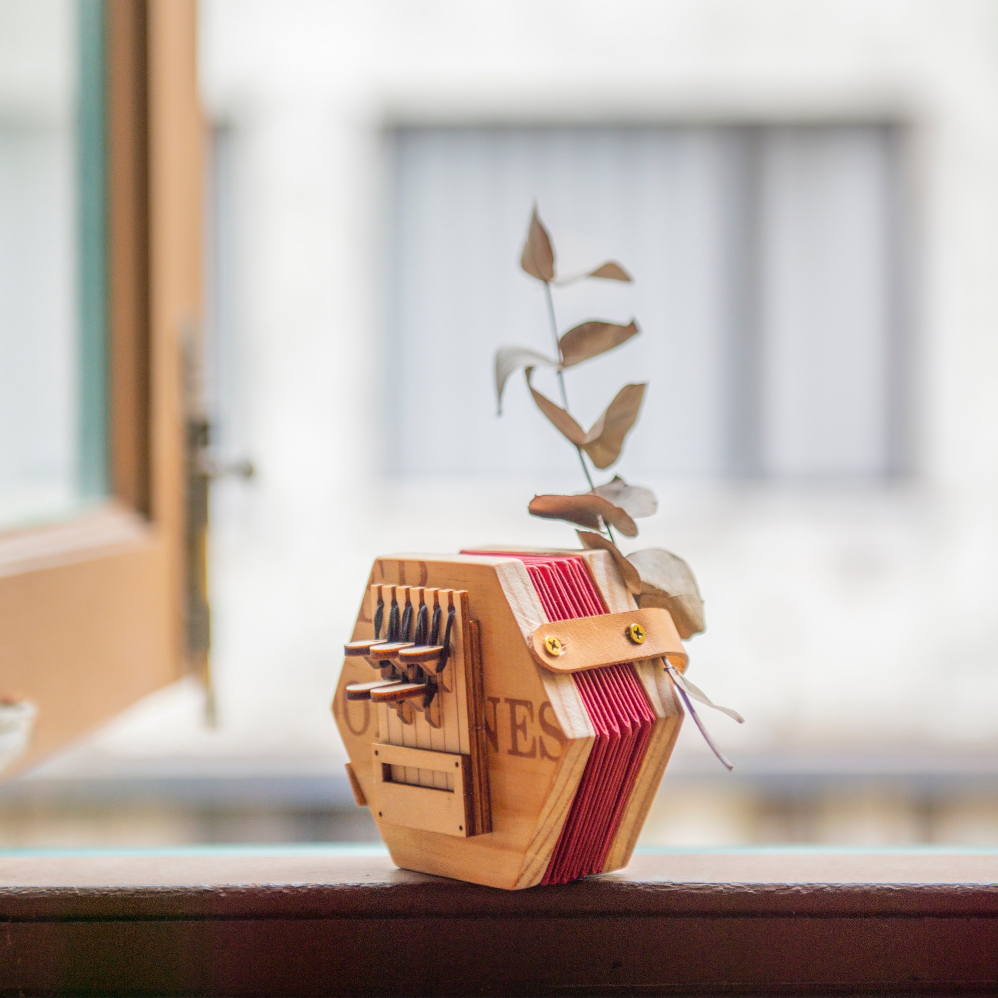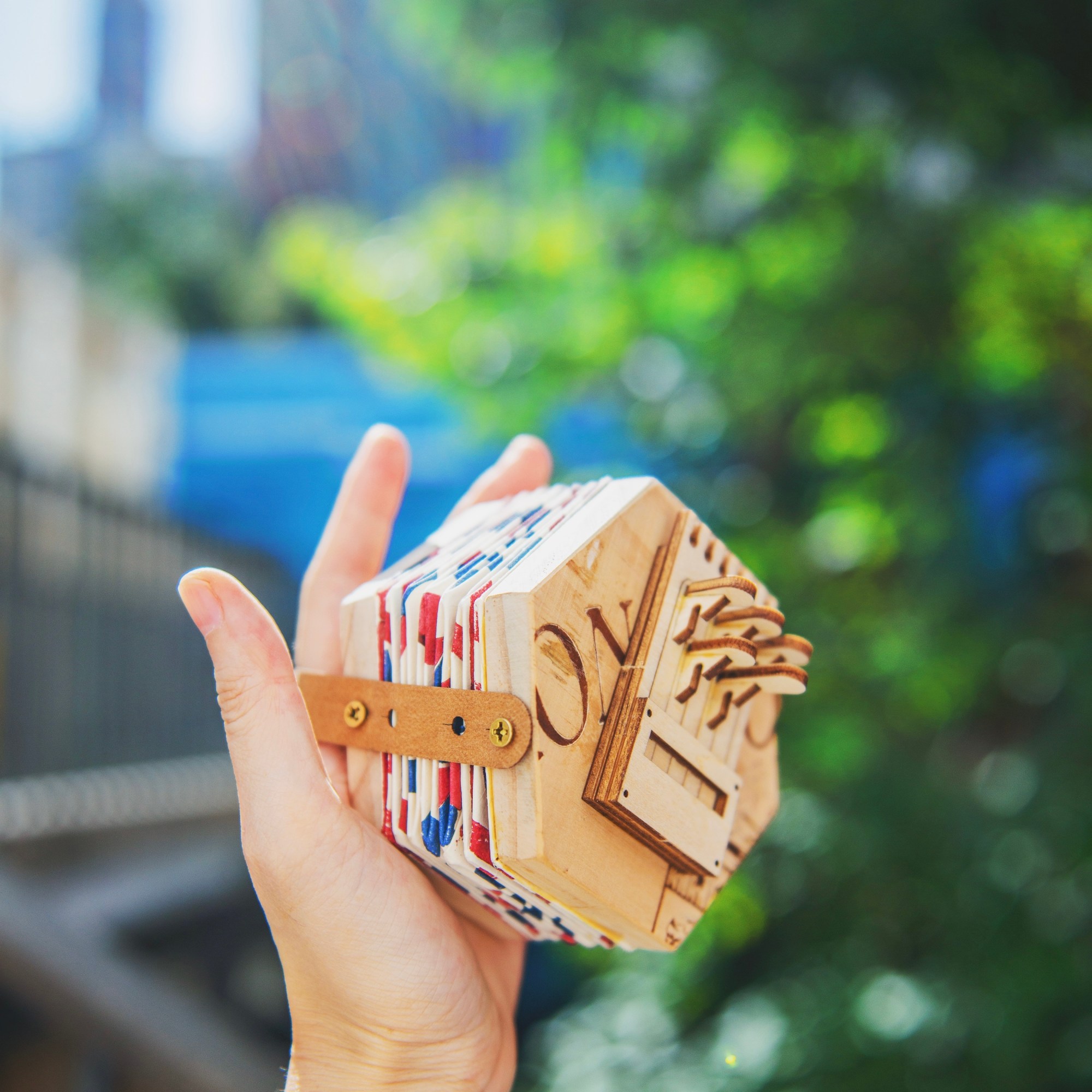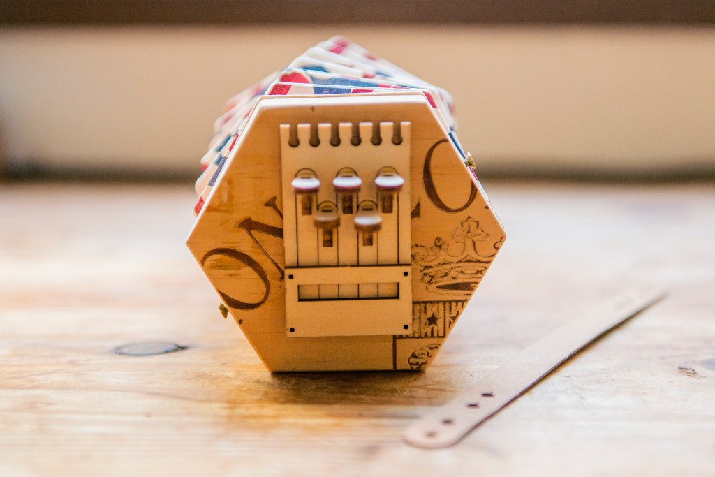 14/ 沒有琴鍵的一方,如上圖左右兩邊裝上手帶,這個位置是讓手掌可以握實手風琴。