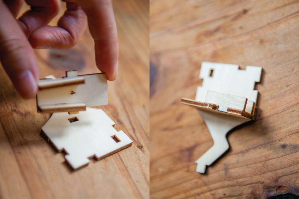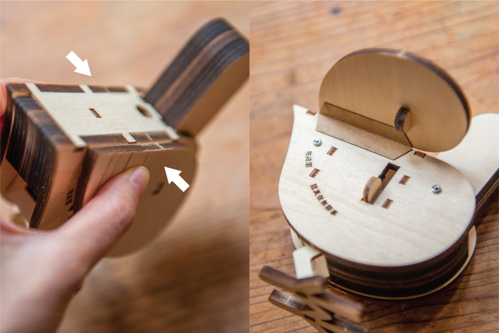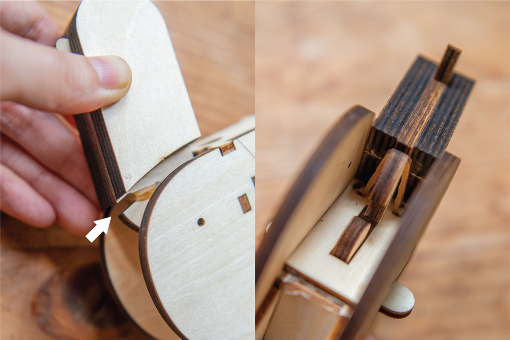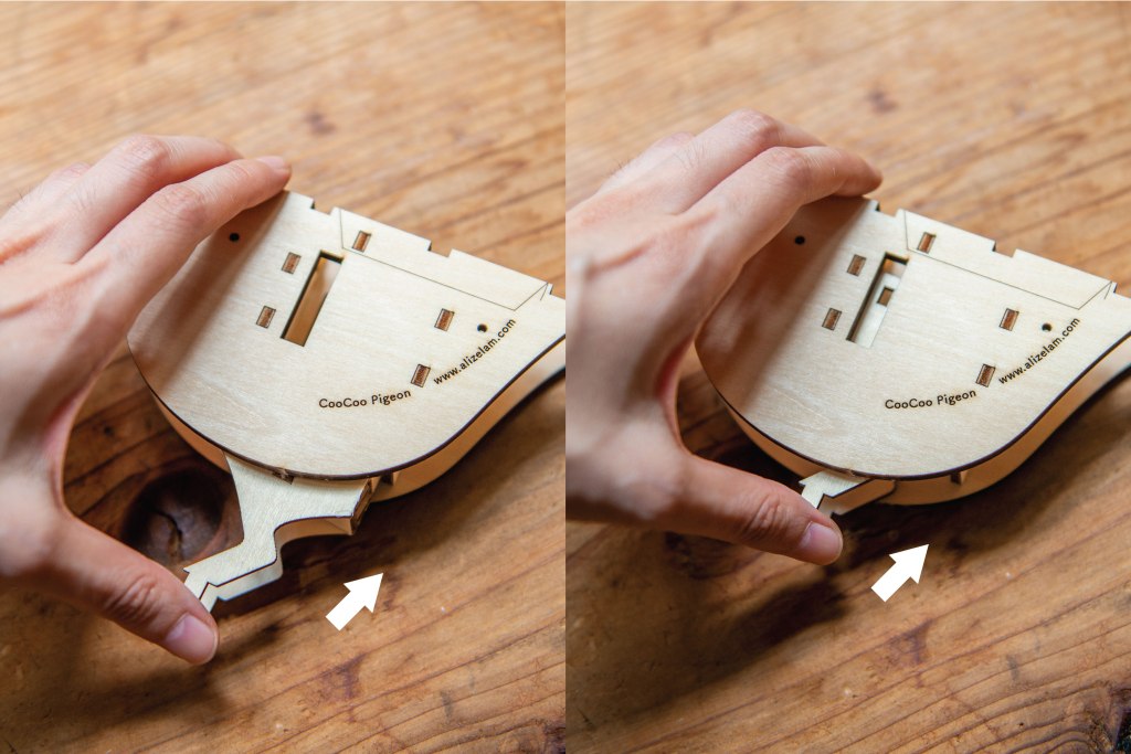 3/ 反轉身體木板到無字嗰邊 (如圖左),將頭先有橡根嘅配件攝落上圖嘅位置,為左減少用膠水,榫位要用陰力攝入去。