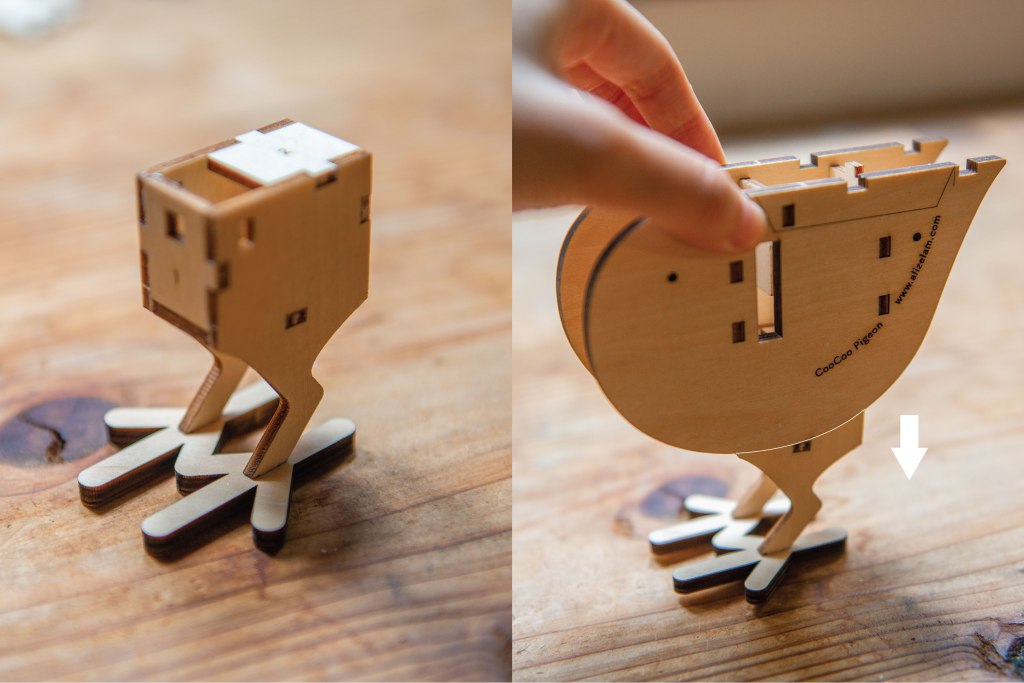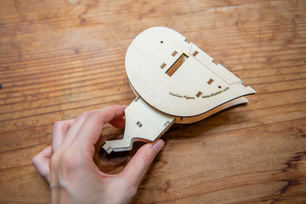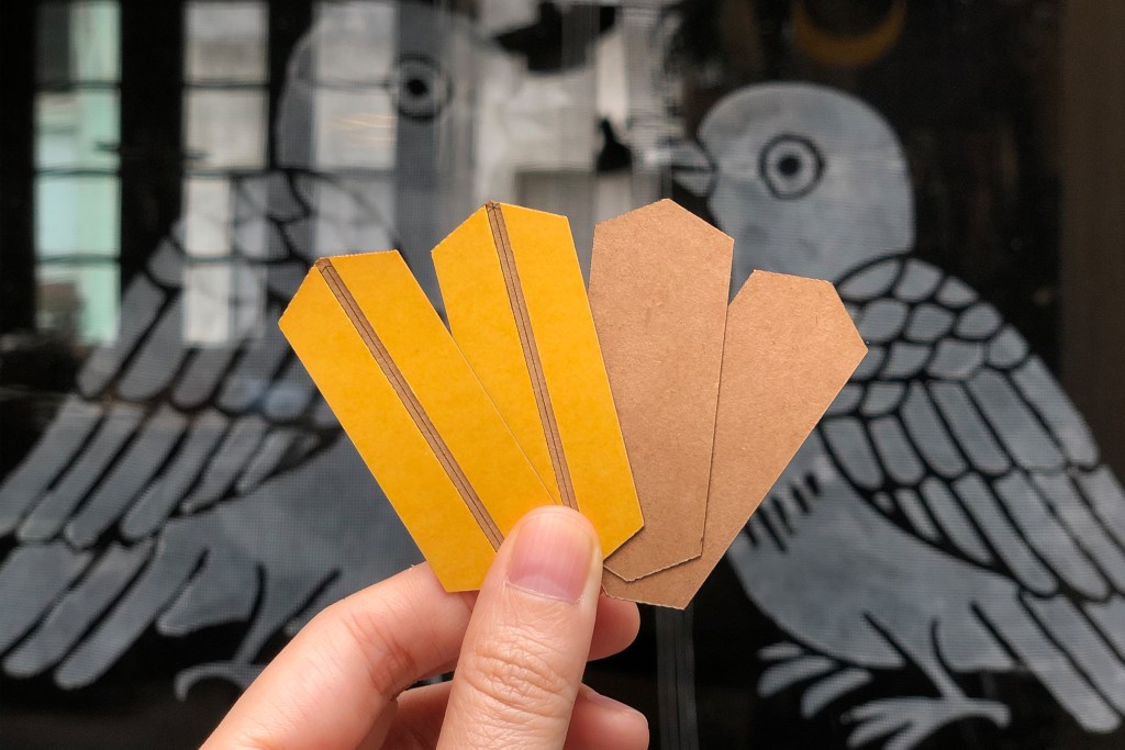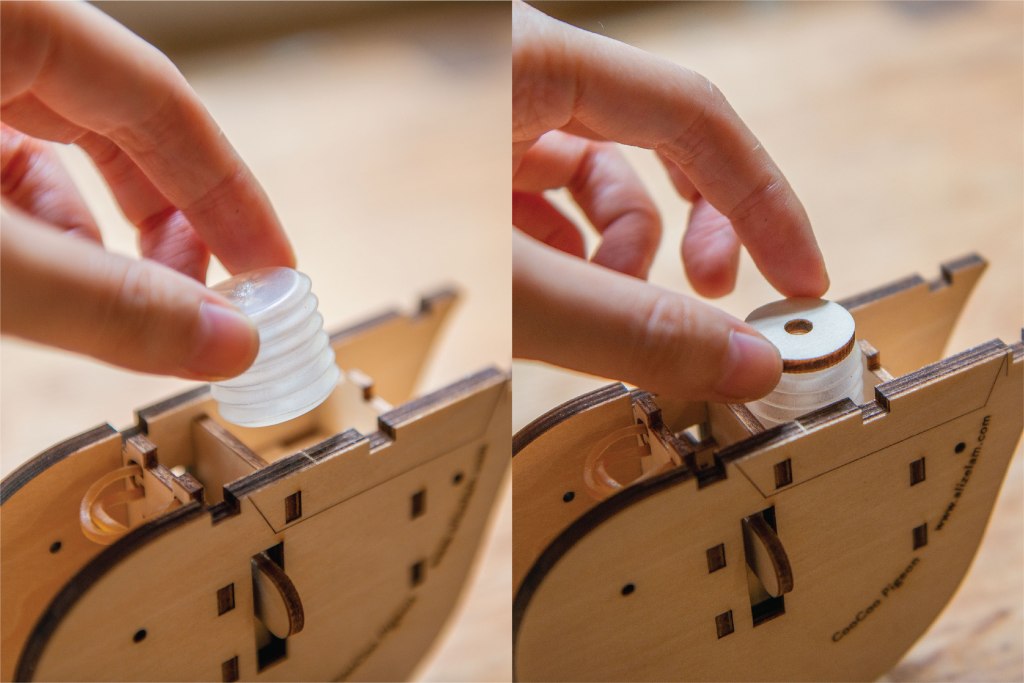 27/ 喺翅膀背面,拍齊翼尖嘅位置貼上卡紙配件;之後再貼上鴿身有梯形框嘅位置。