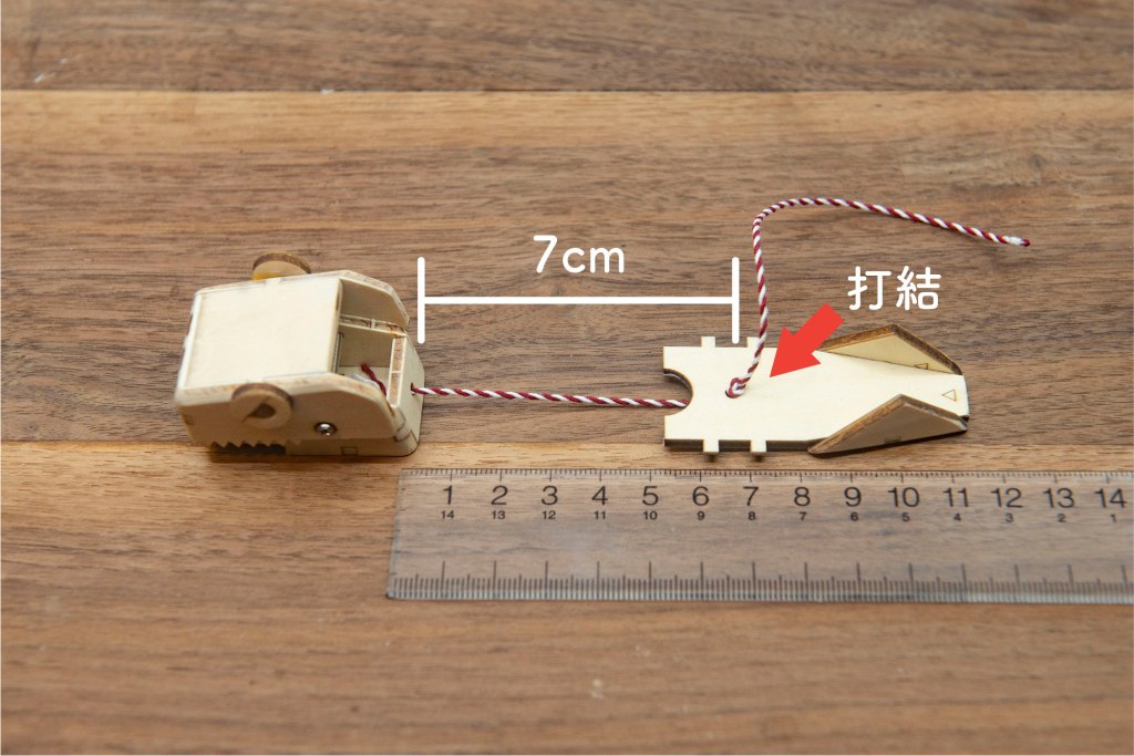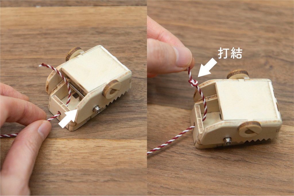 91/ 綿繩如上圖穿過頭部後面的小圓孔,繩尾打結。
