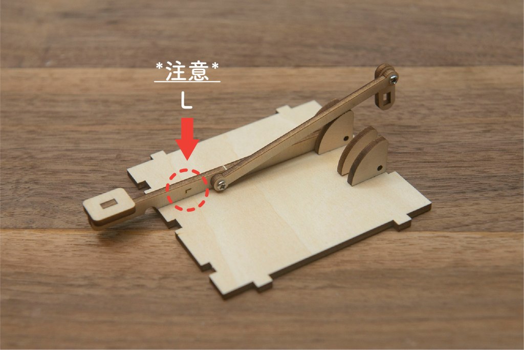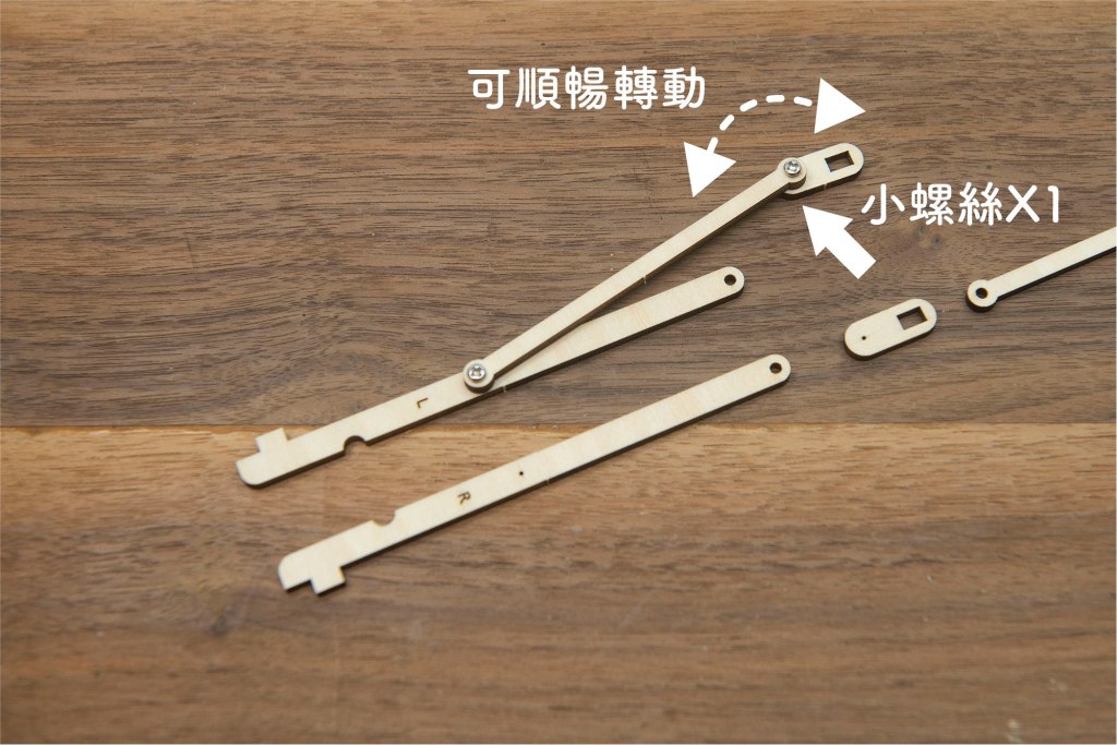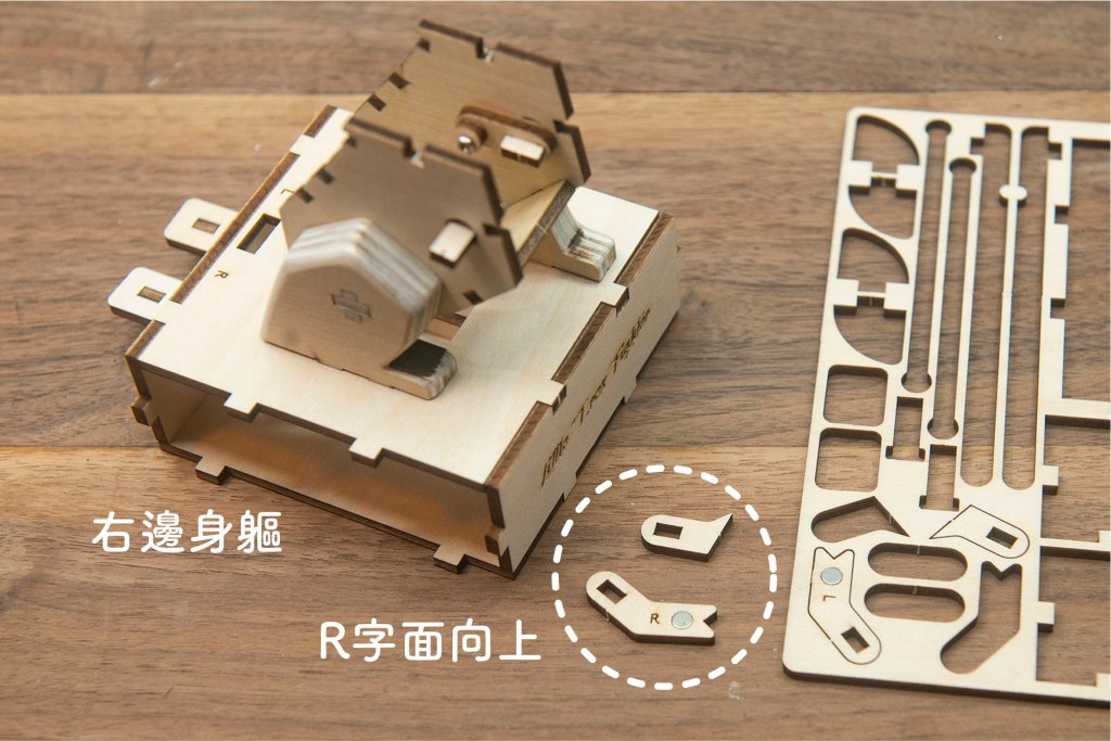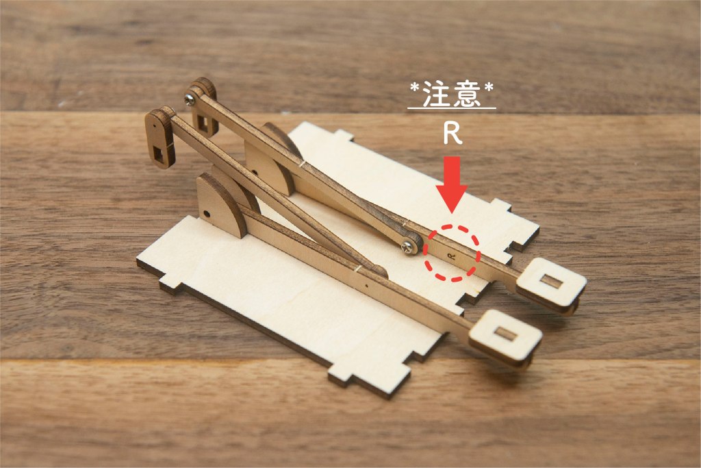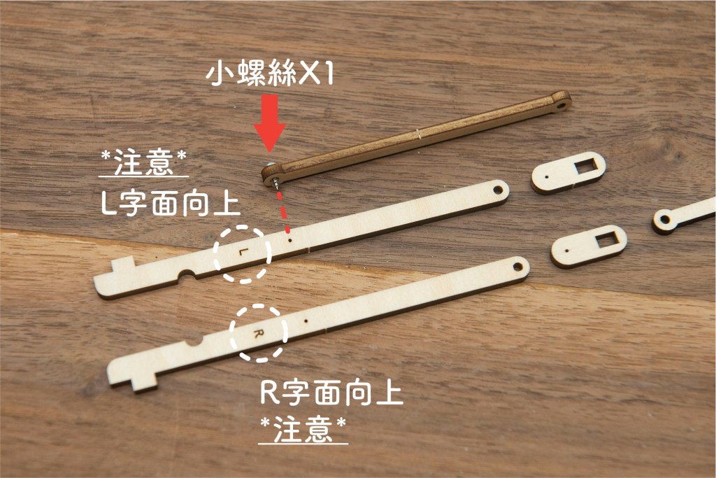 23/ 有L和R字樣的零件,字面朝上,小螺絲穿過木桿零件。