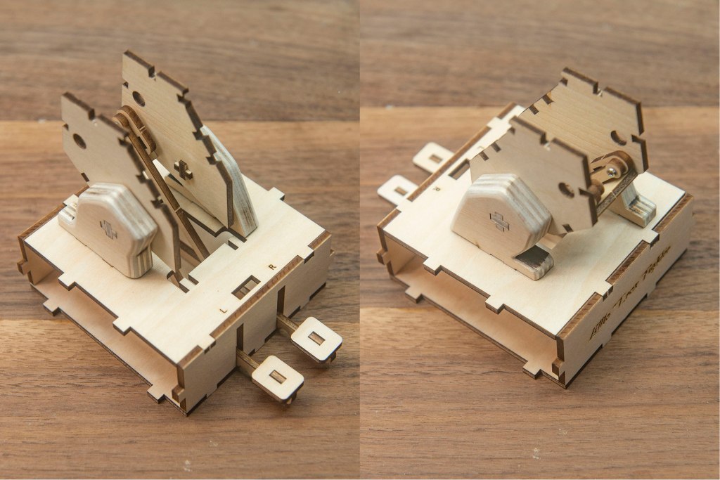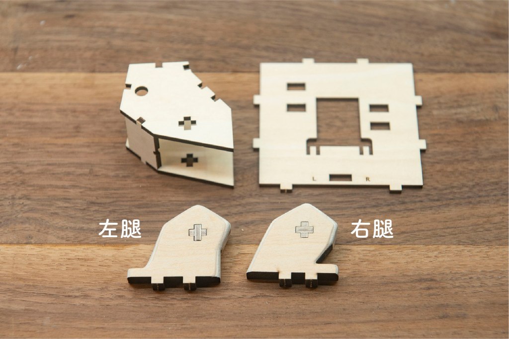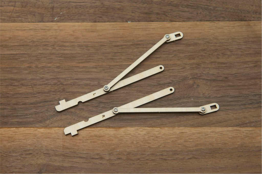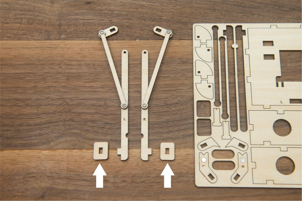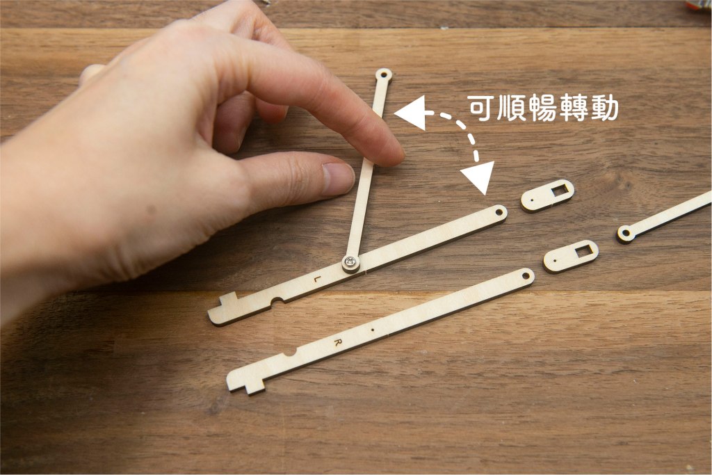 23/ 有L和R字樣的零件,字面朝上,小螺絲穿過木桿零件。