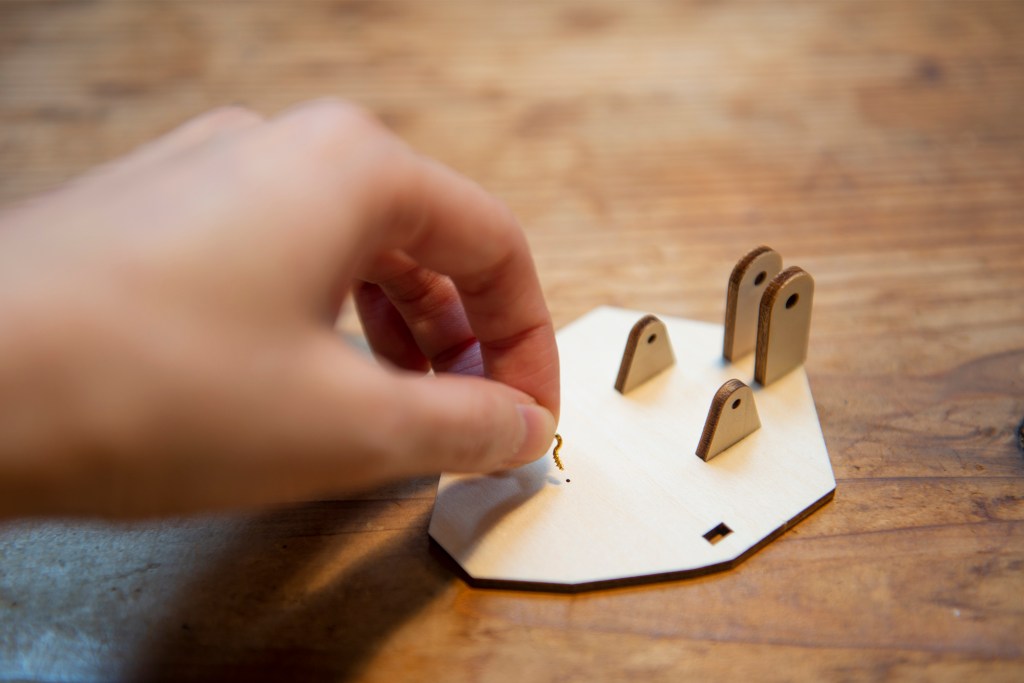 8/ 在前方的小孔上,慢慢扭上小勾形螺絲。