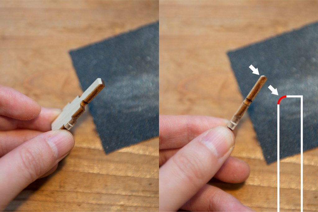 18/ 打磨正如上圖示的狀態就可以了,磨得太圓的話,稍後的機關會太鬆而出現問題。