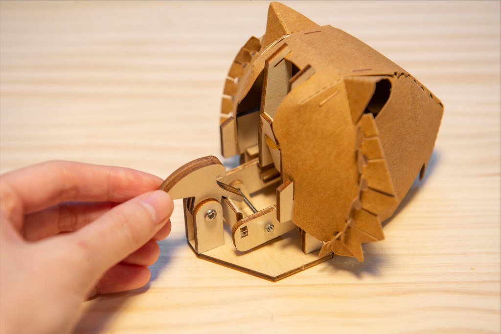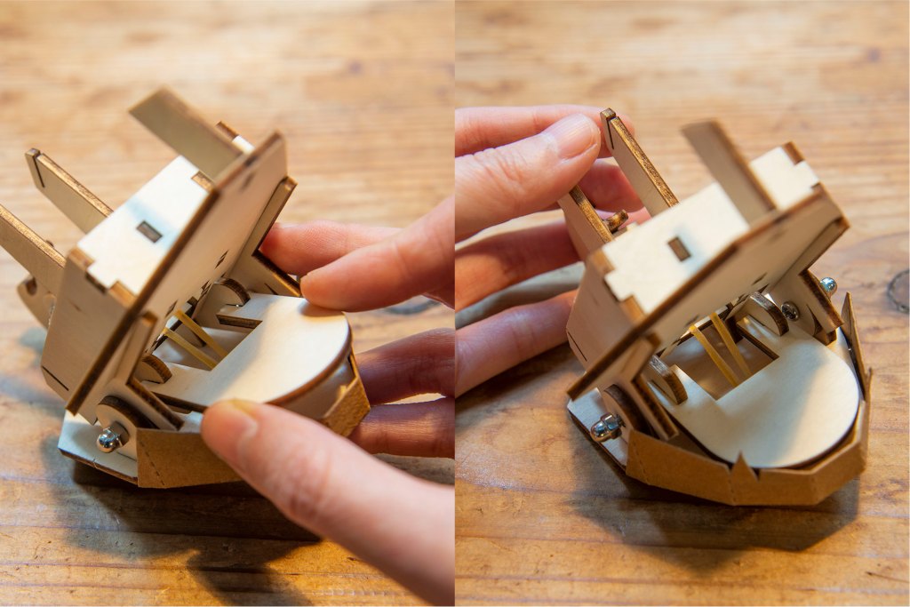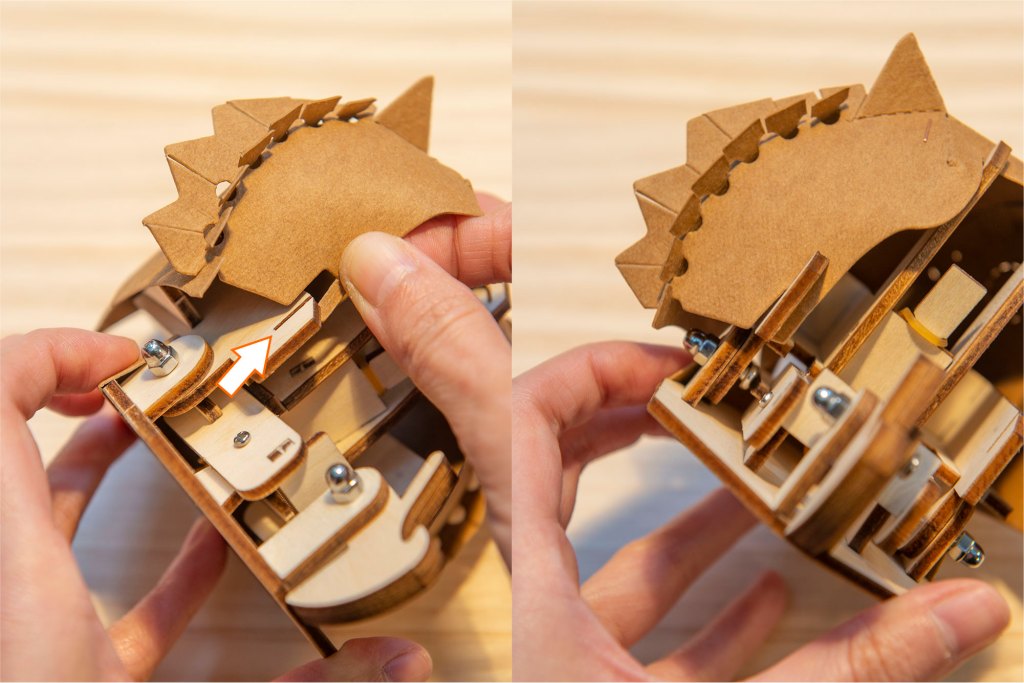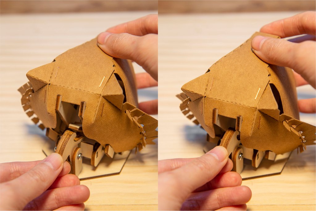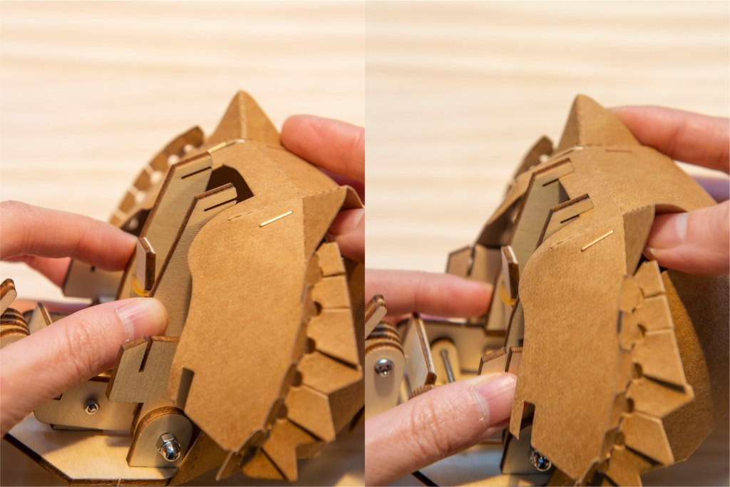 42/ 此時可測試機關能否正常運作:先如圖左卡住舌頭零件,再如圖右扣住後腦位置,在平面上會較易操作。